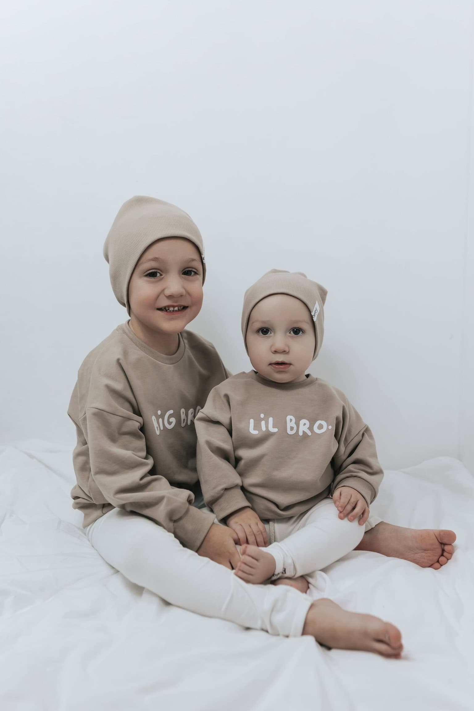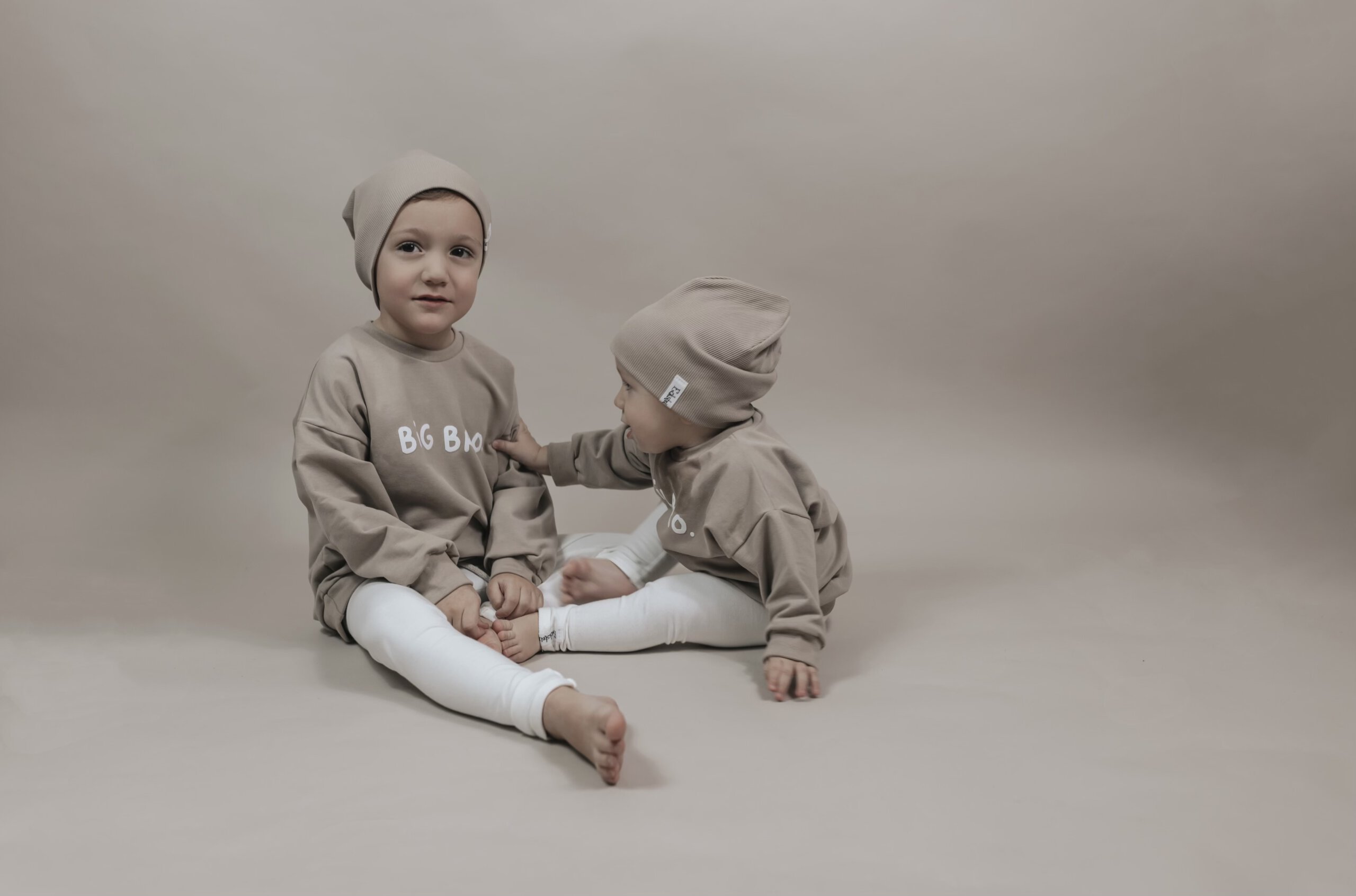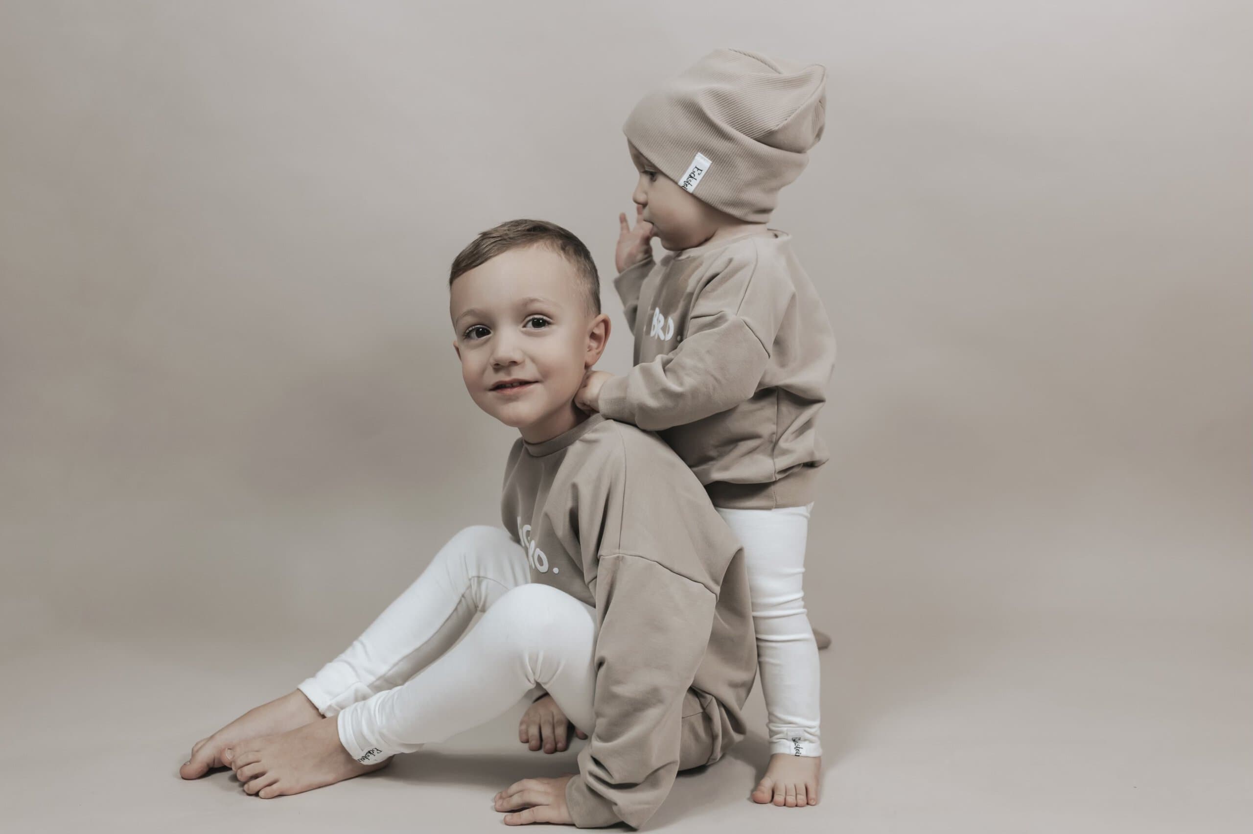 Auf den Bildern tragen Lio und Matteo die Farbe dunkles beige aus dem Kuschelsweat.