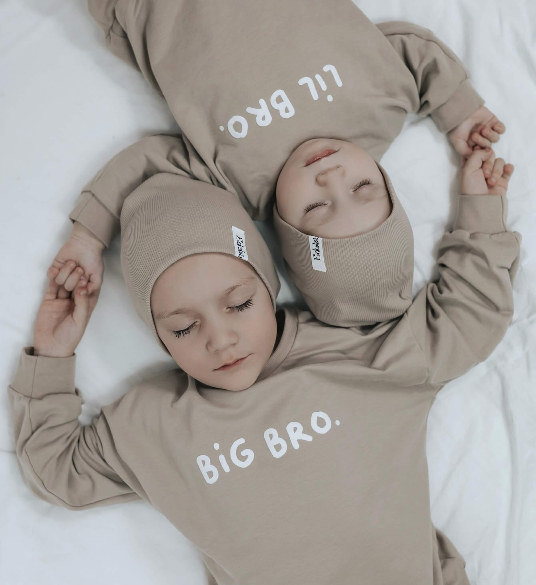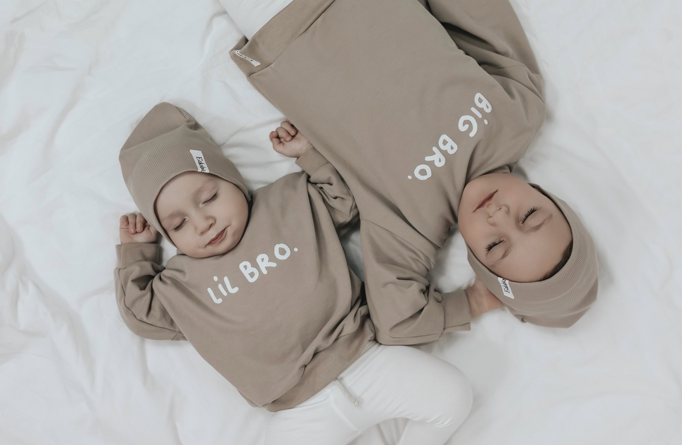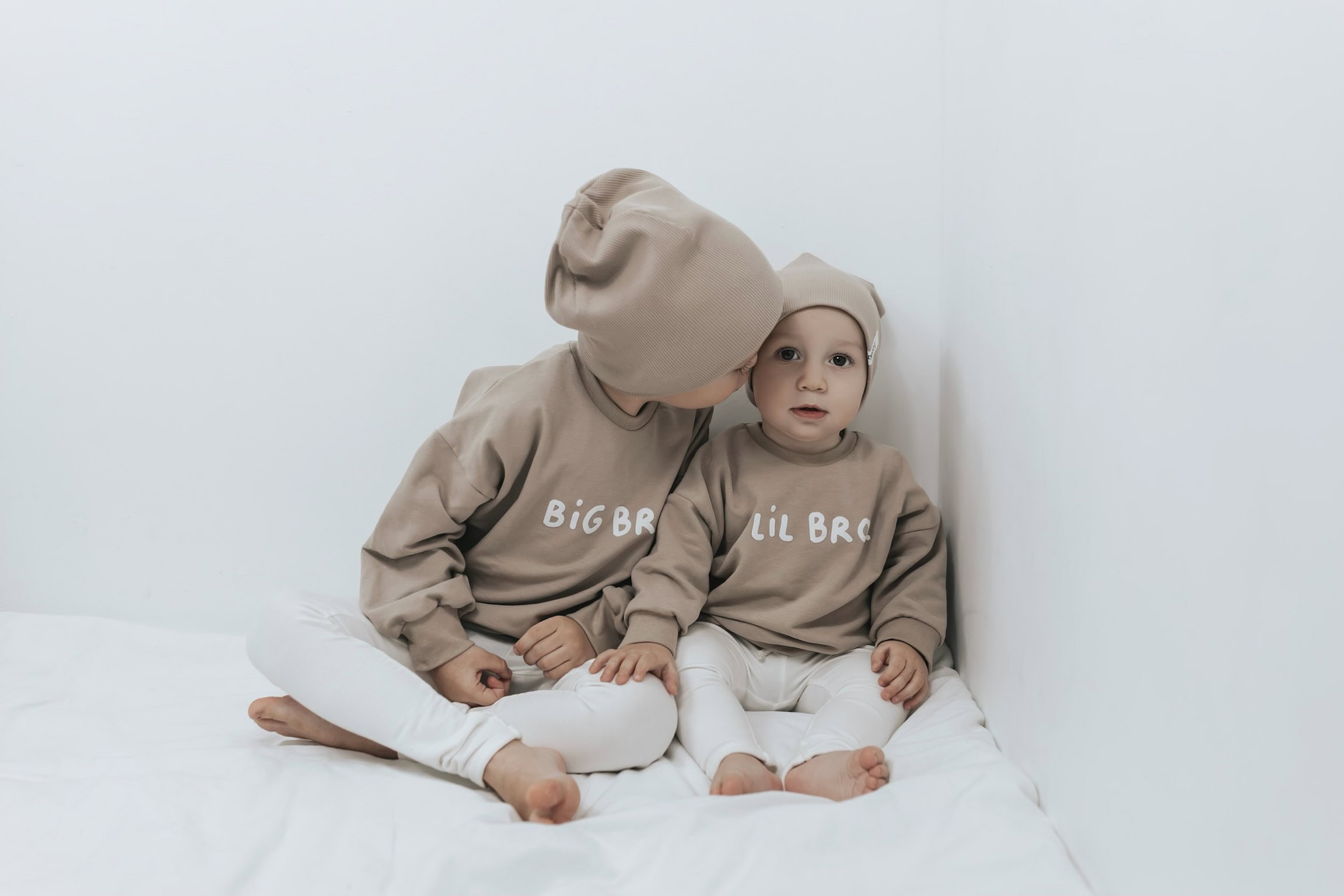 Auf den Bildern tragen Lio und Matteo die Farbe dunkles beige aus dem Kuschelsweat.