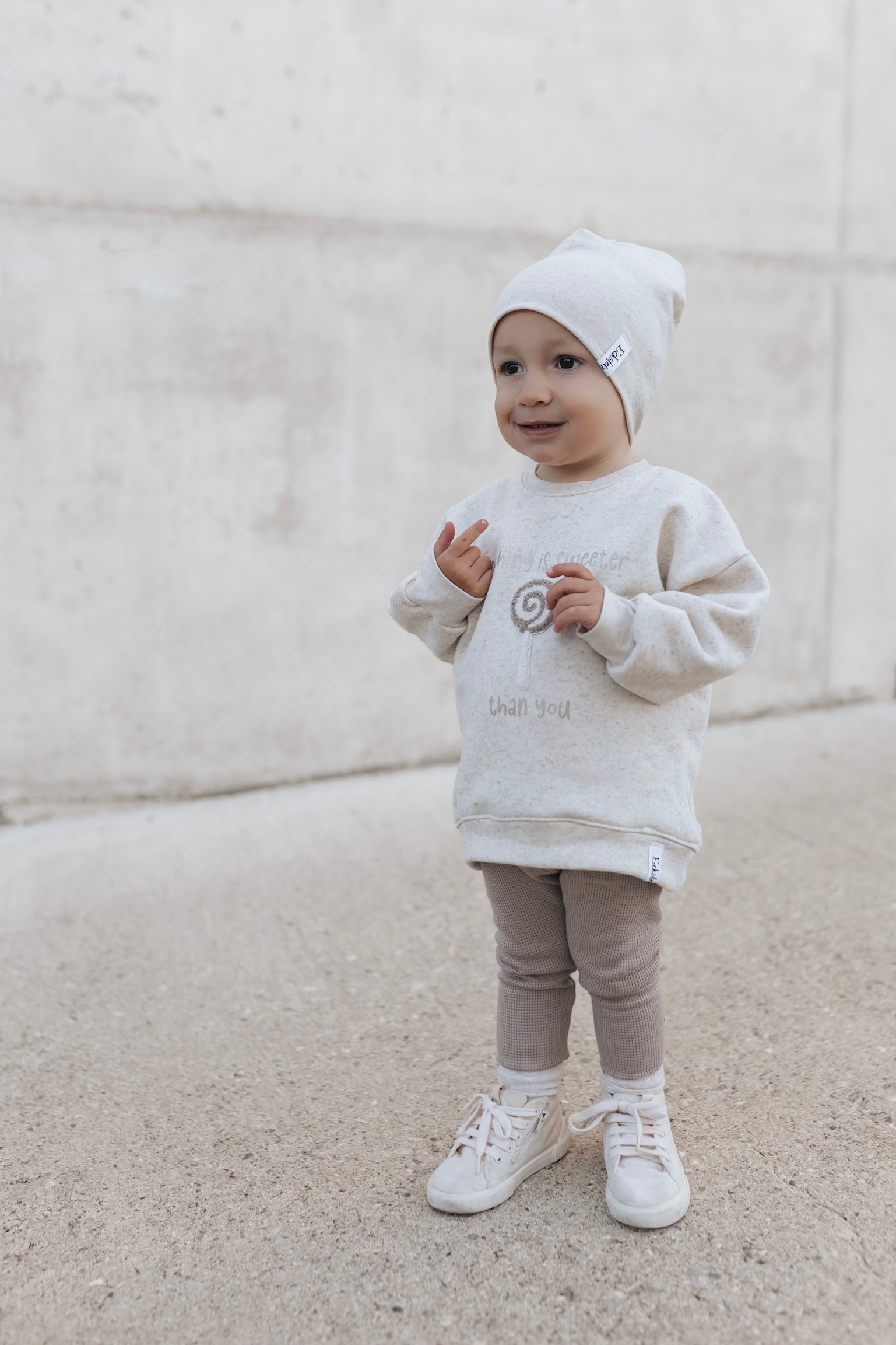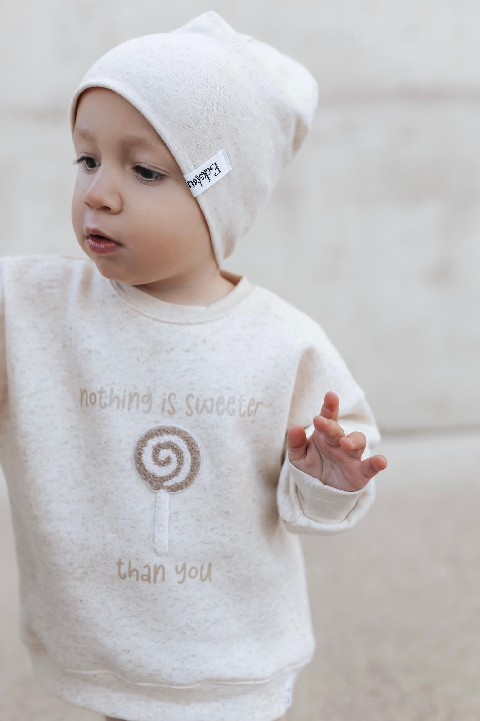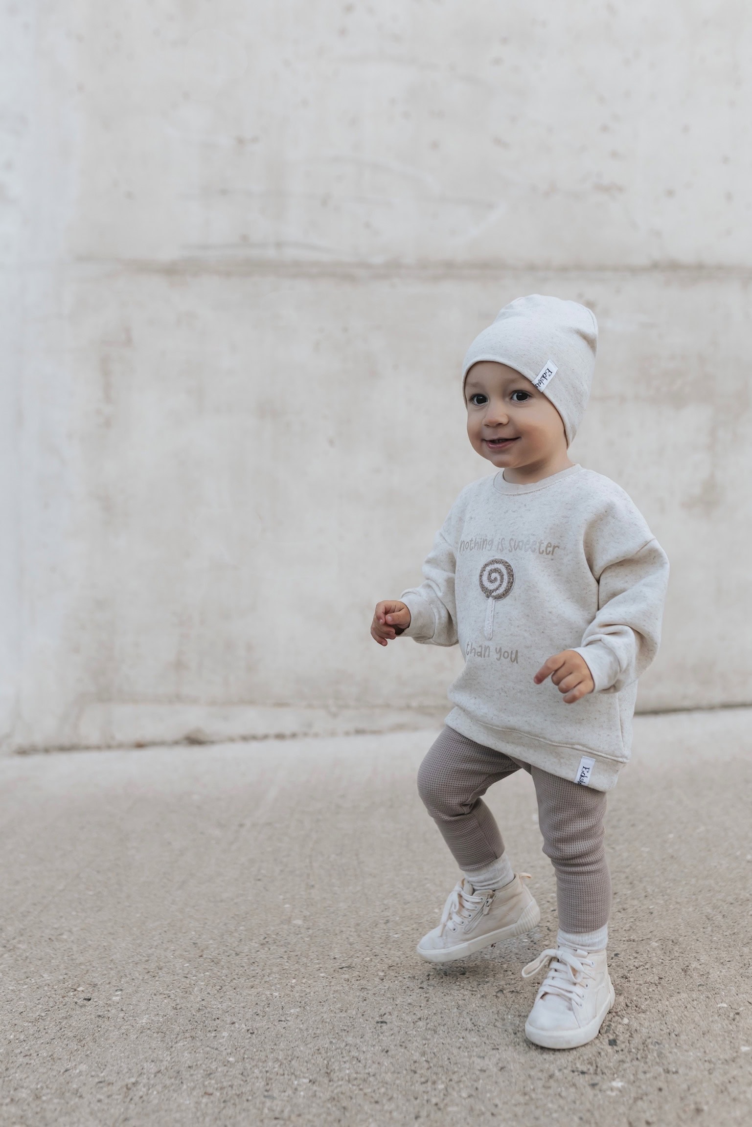 Material: Natur Sprenkel Kuschelsweat: 70% Baumwolle, 25% Leinen, 5% Elasthan