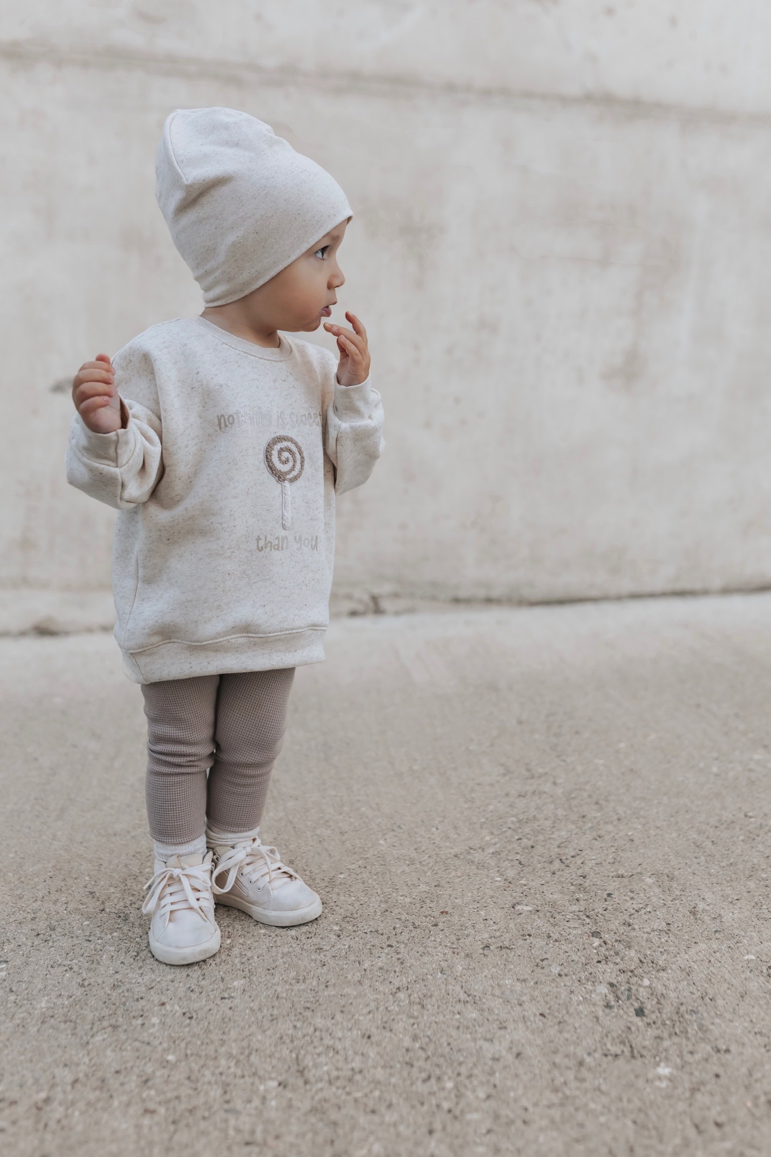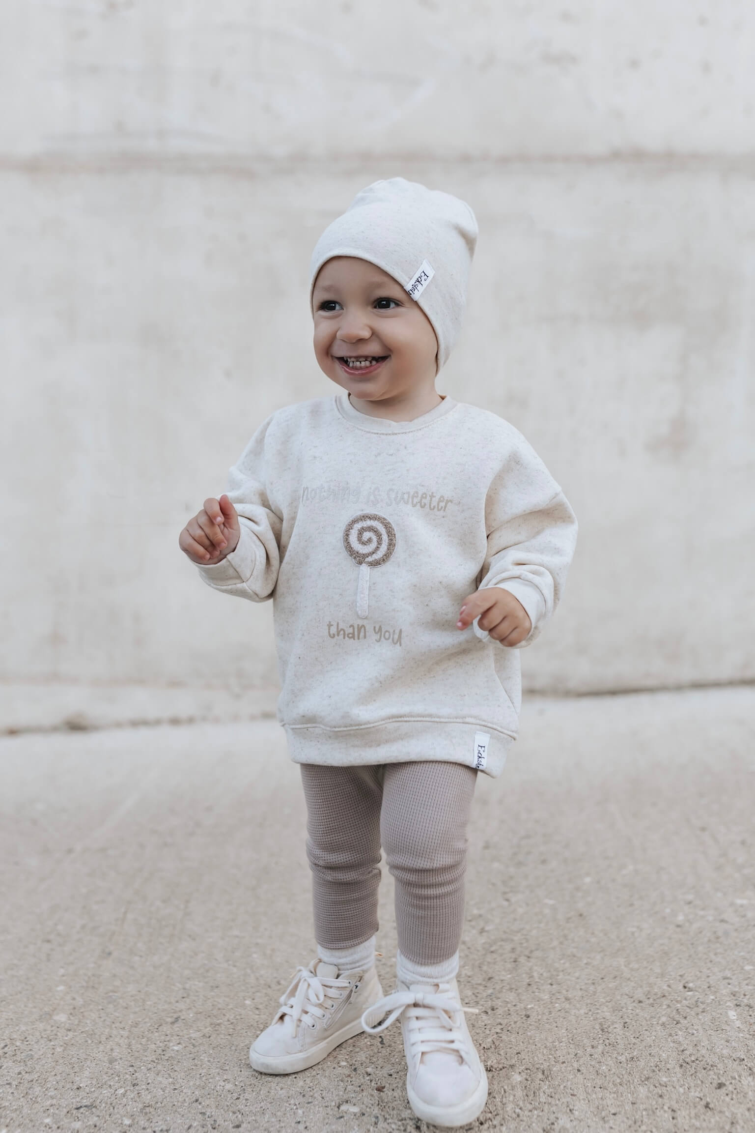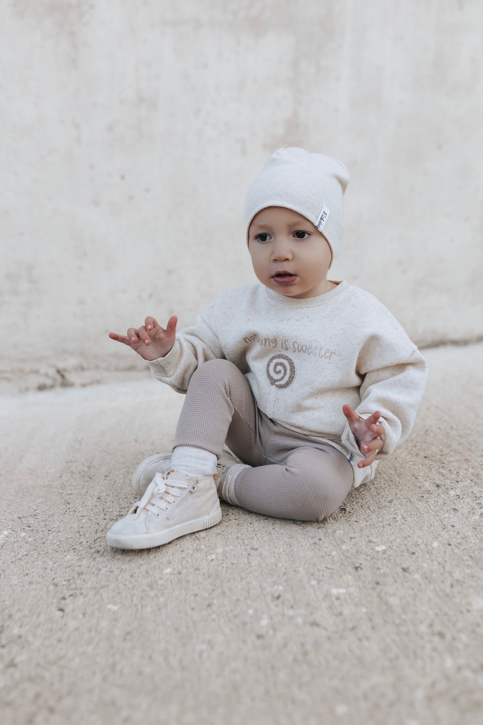 Material: Natur Sprenkel Kuschelsweat: 70% Baumwolle, 25% Leinen, 5% Elasthan