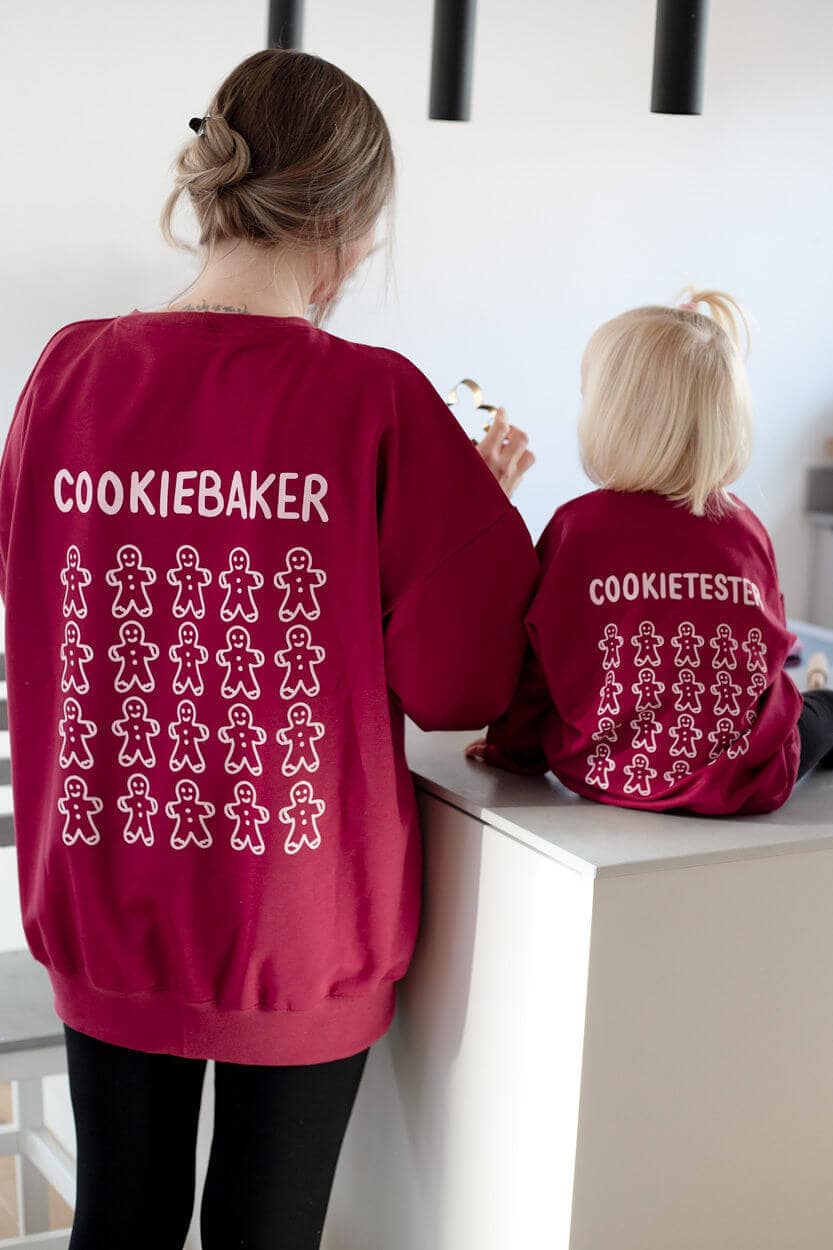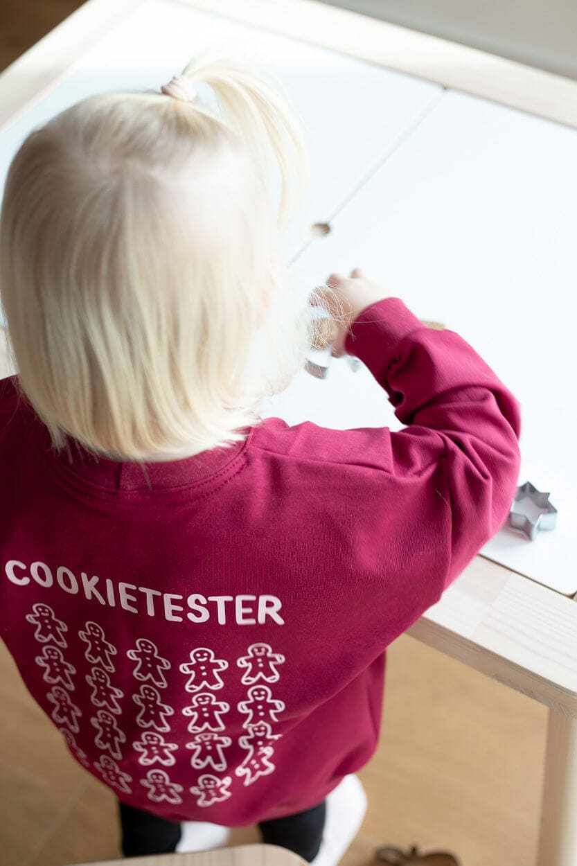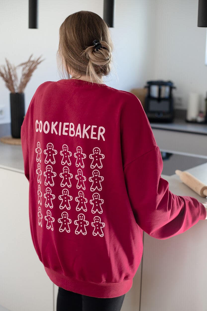 Der Sweater auf den Bildern hat die Farbe burgundy – ein tolles Weinrot. Der Rückenaufdruck ist in einem ganz zarten rosa. Vorne auf dem Sweater ist ebenfalls ein kleiner Cookie abgebildet.