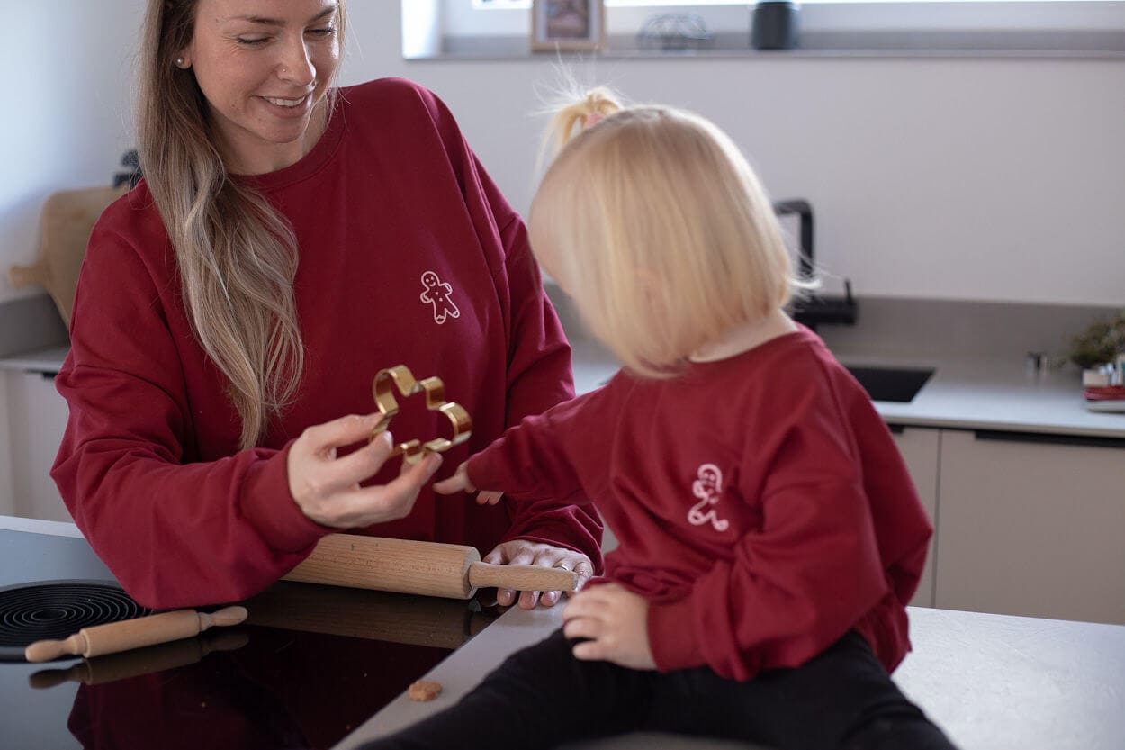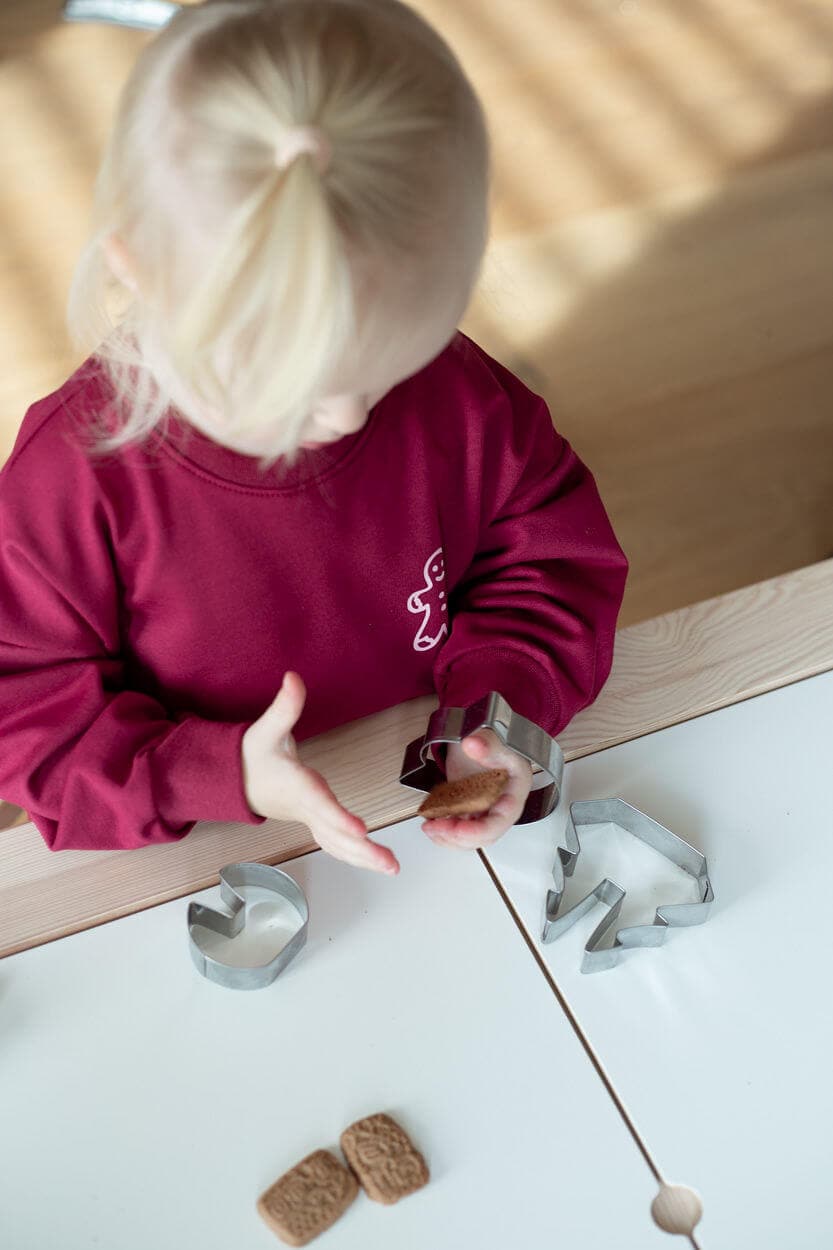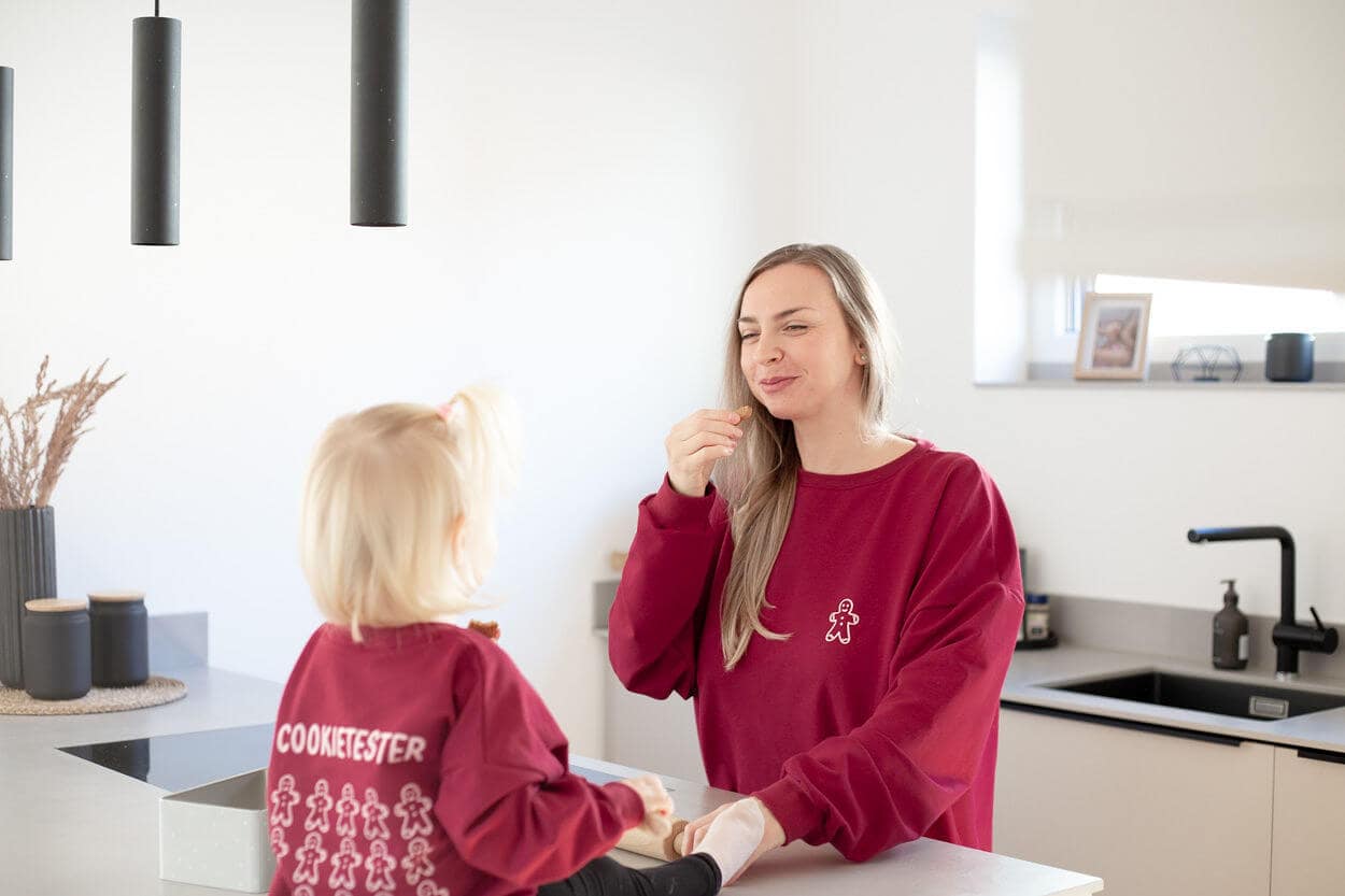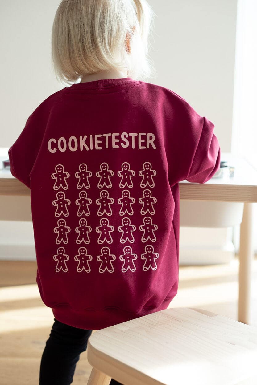 Der Sweater auf den Bildern hat die Farbe burgundy – ein tolles Weinrot. Der Rückenaufdruck ist in einem ganz zarten rosa. Vorne auf dem Sweater ist ebenfalls ein kleiner Cookie abgebildet.