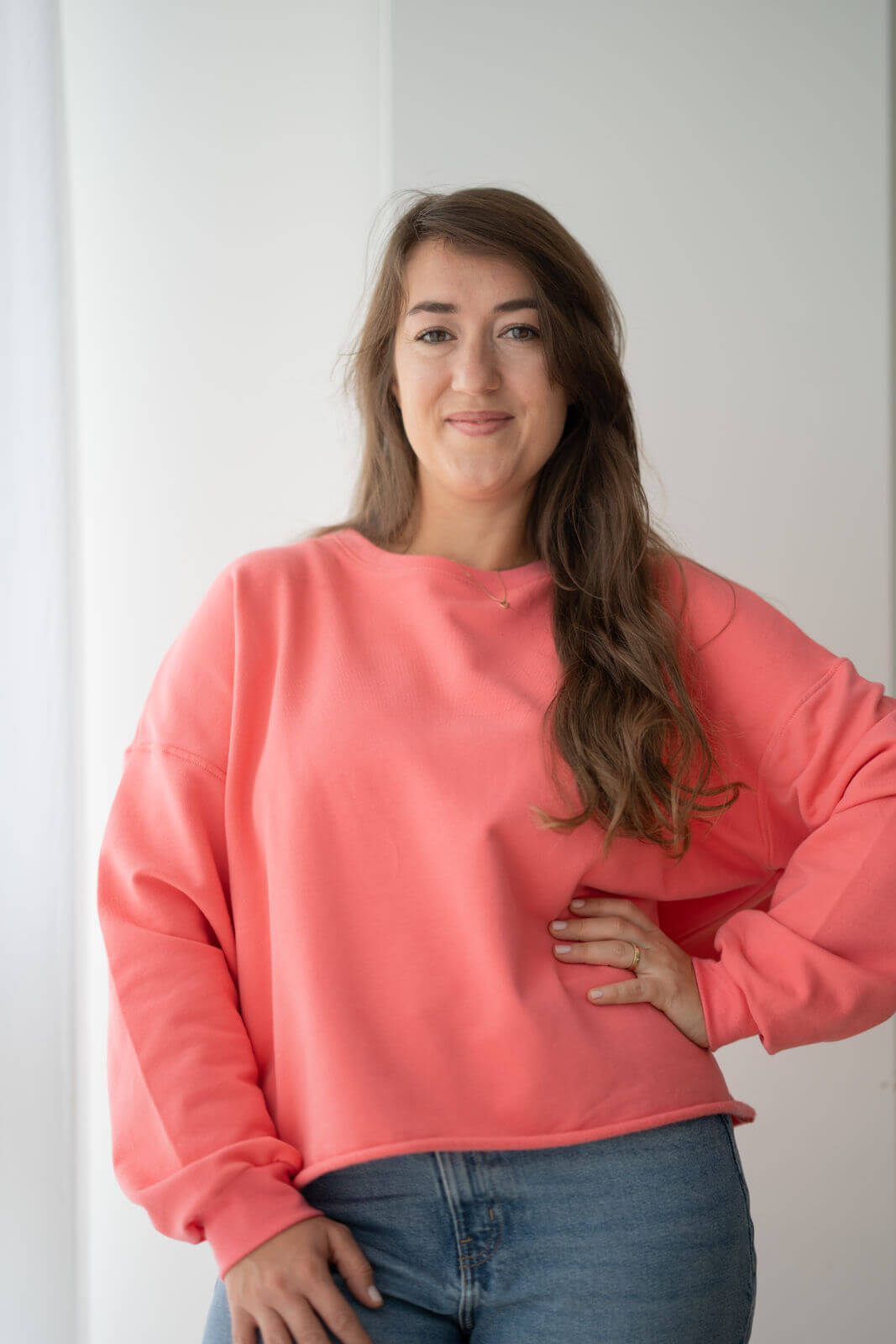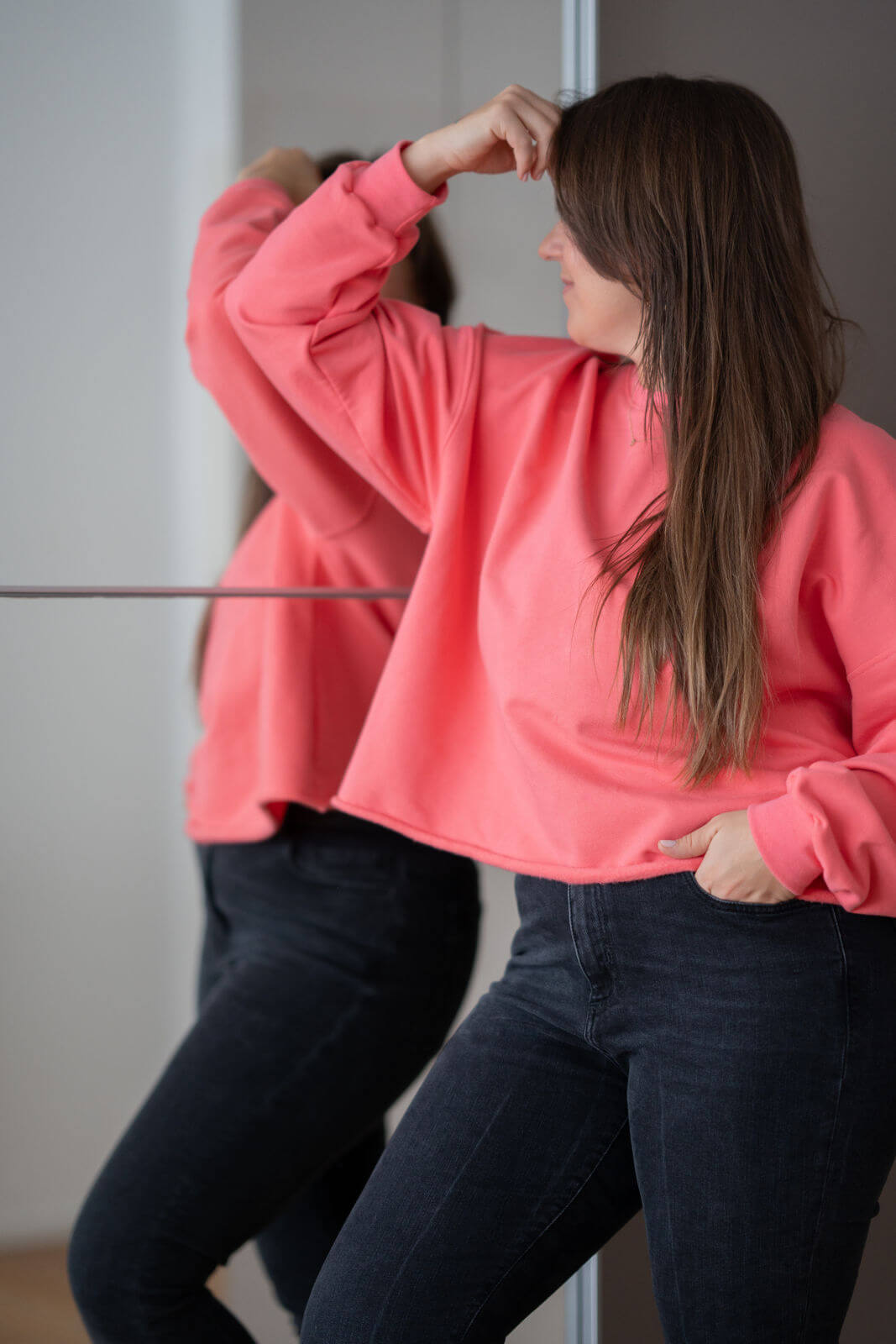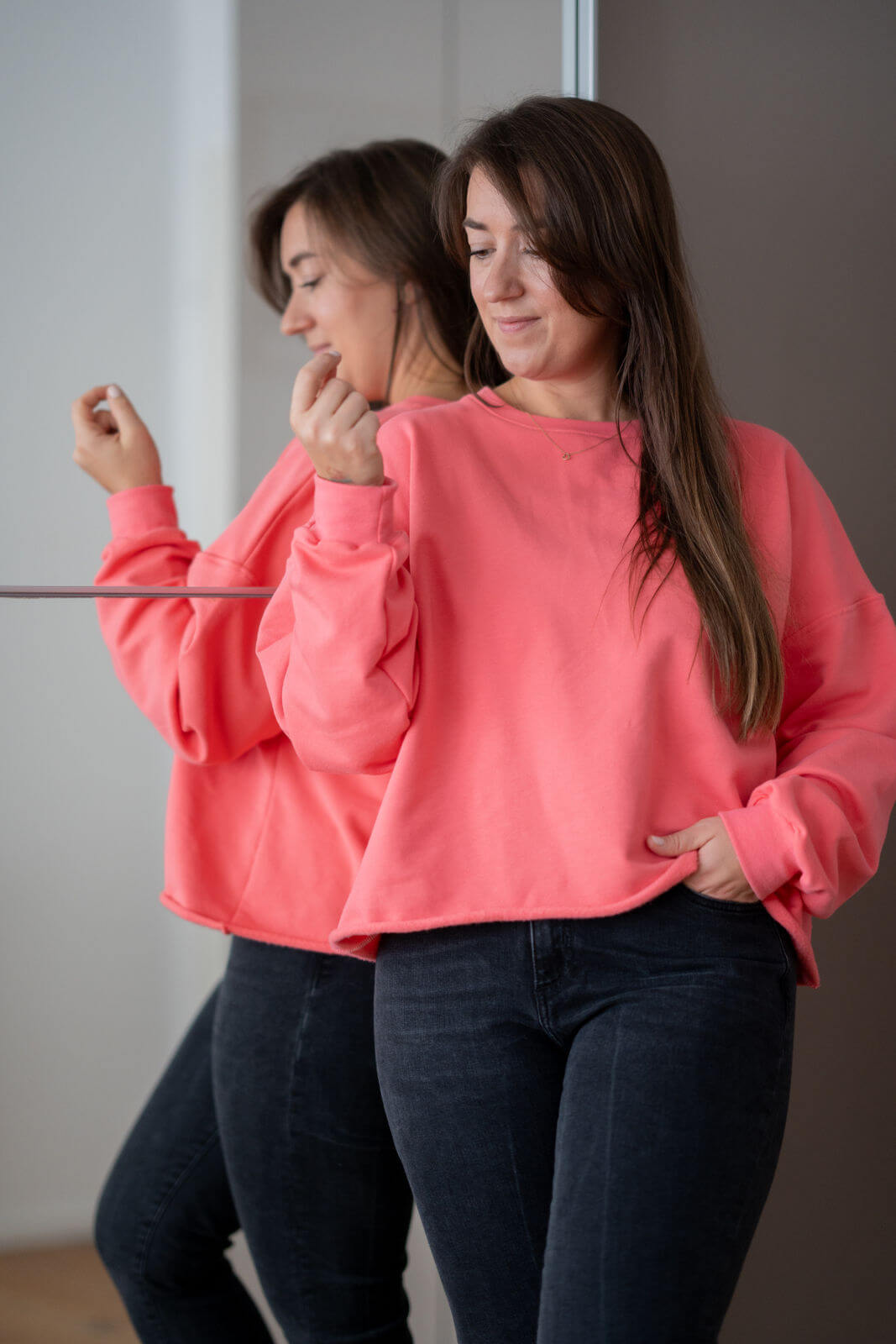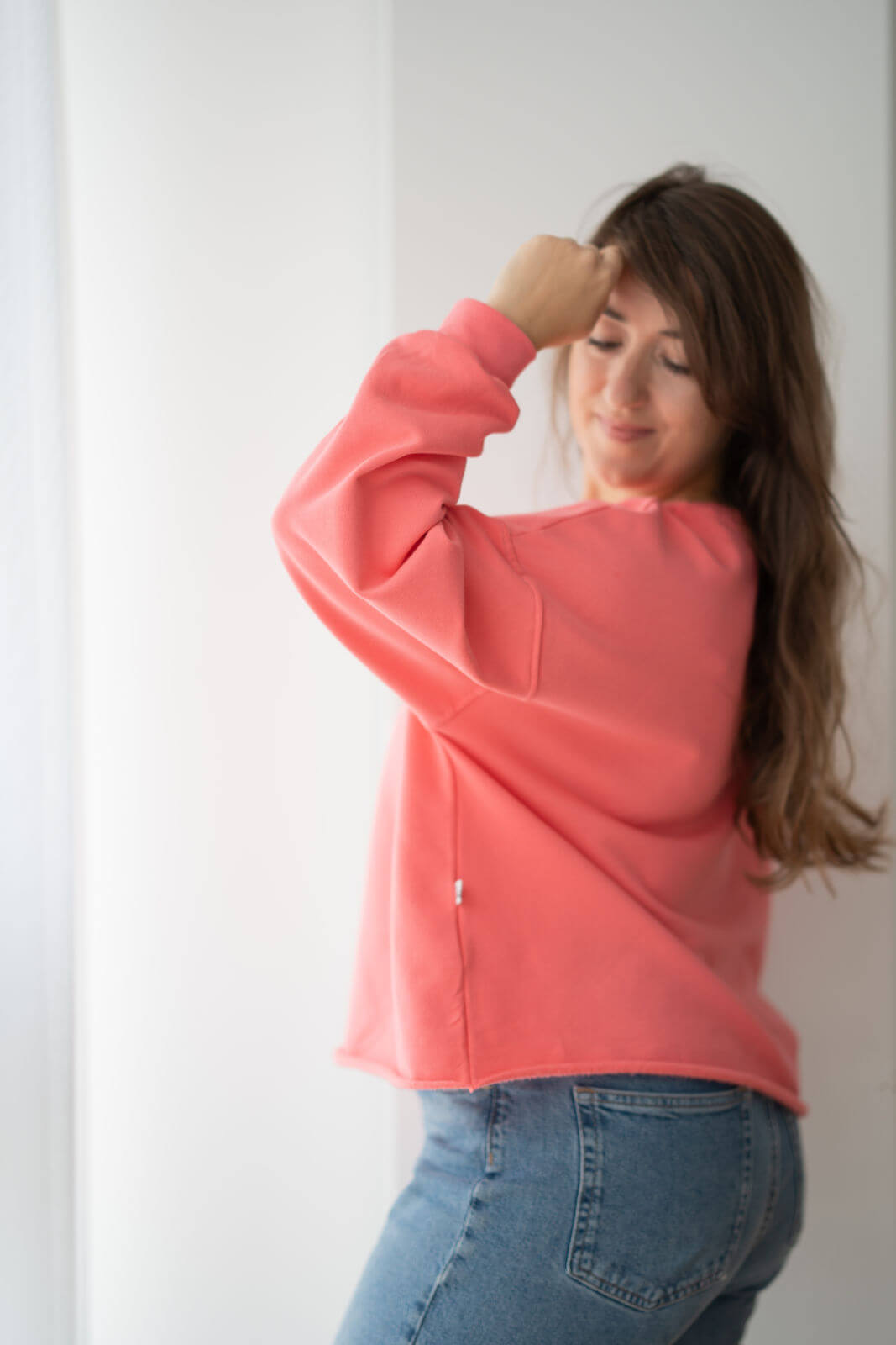 Der Pullover fällt oversize aus. Der Herbst/Winter Sweat ist super weich und flauschig auf der Innenseite. Der Sweater hat am Saum kein Bündchen und rollt sich leicht nach oben. Er lässt sich super in Hose oder Rock stecken.