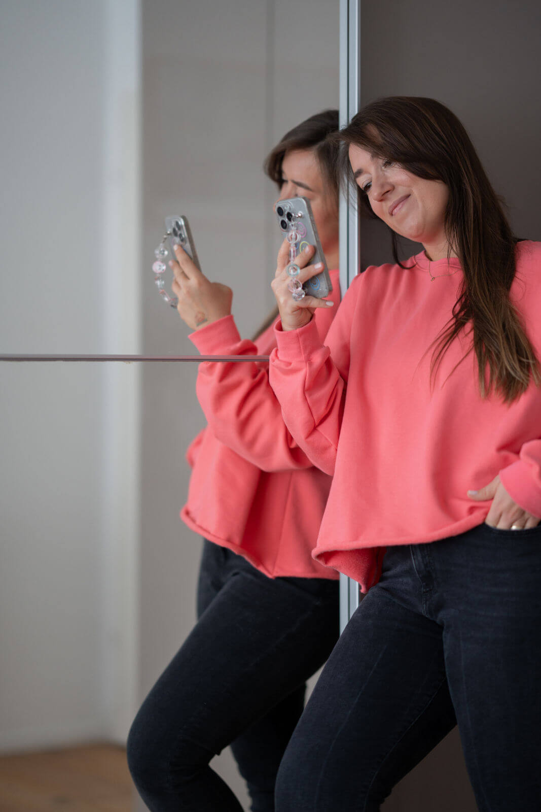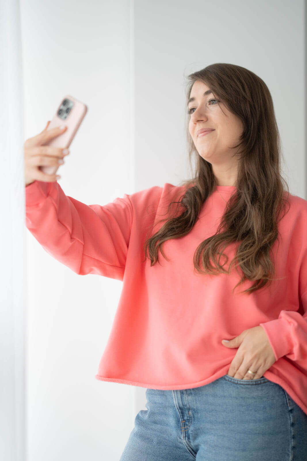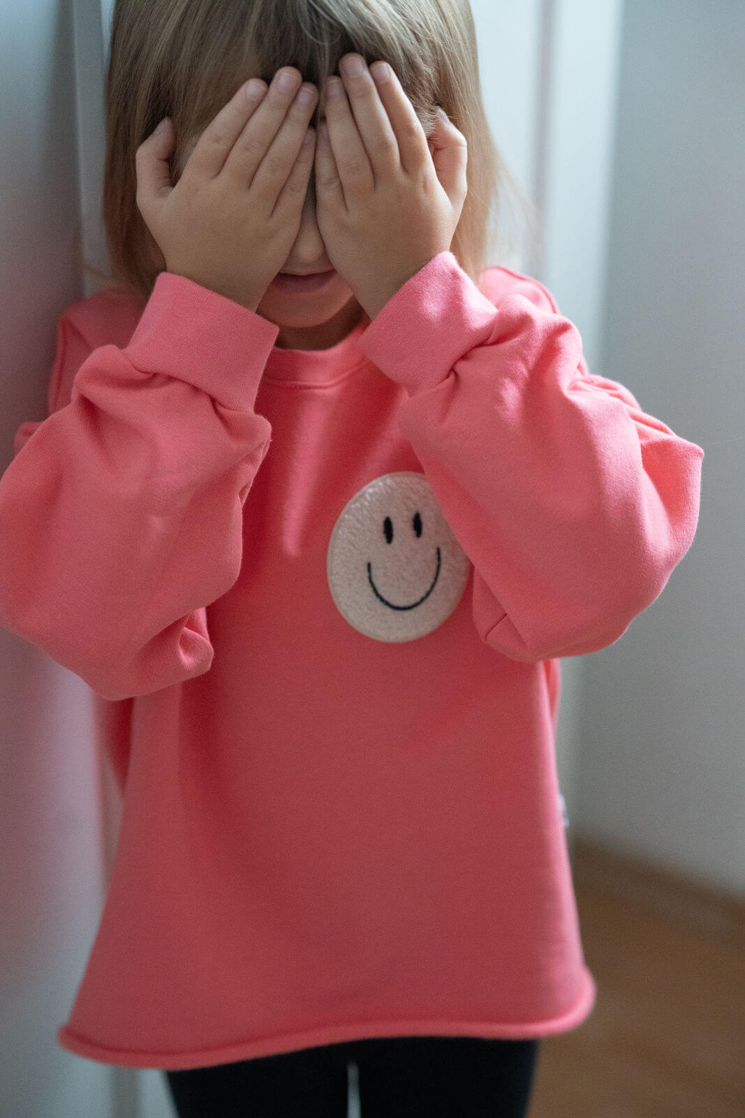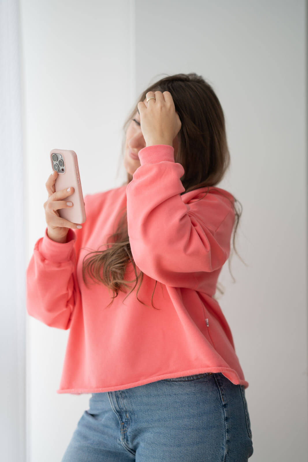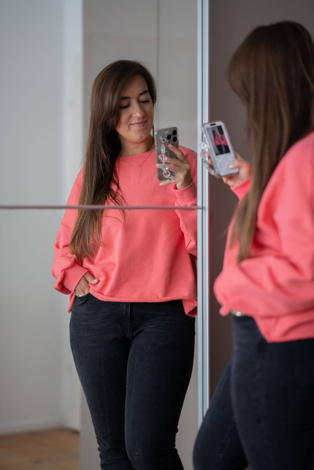Der Pullover fällt oversize aus. Der Herbst/Winter Sweat ist super weich und flauschig auf der Innenseite. Der Sweater hat am Saum kein Bündchen und rollt sich leicht nach oben. Er lässt sich super in Hose oder Rock stecken.